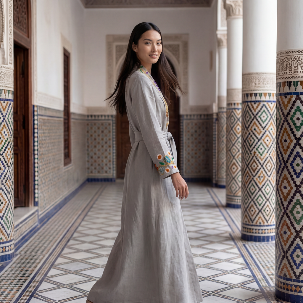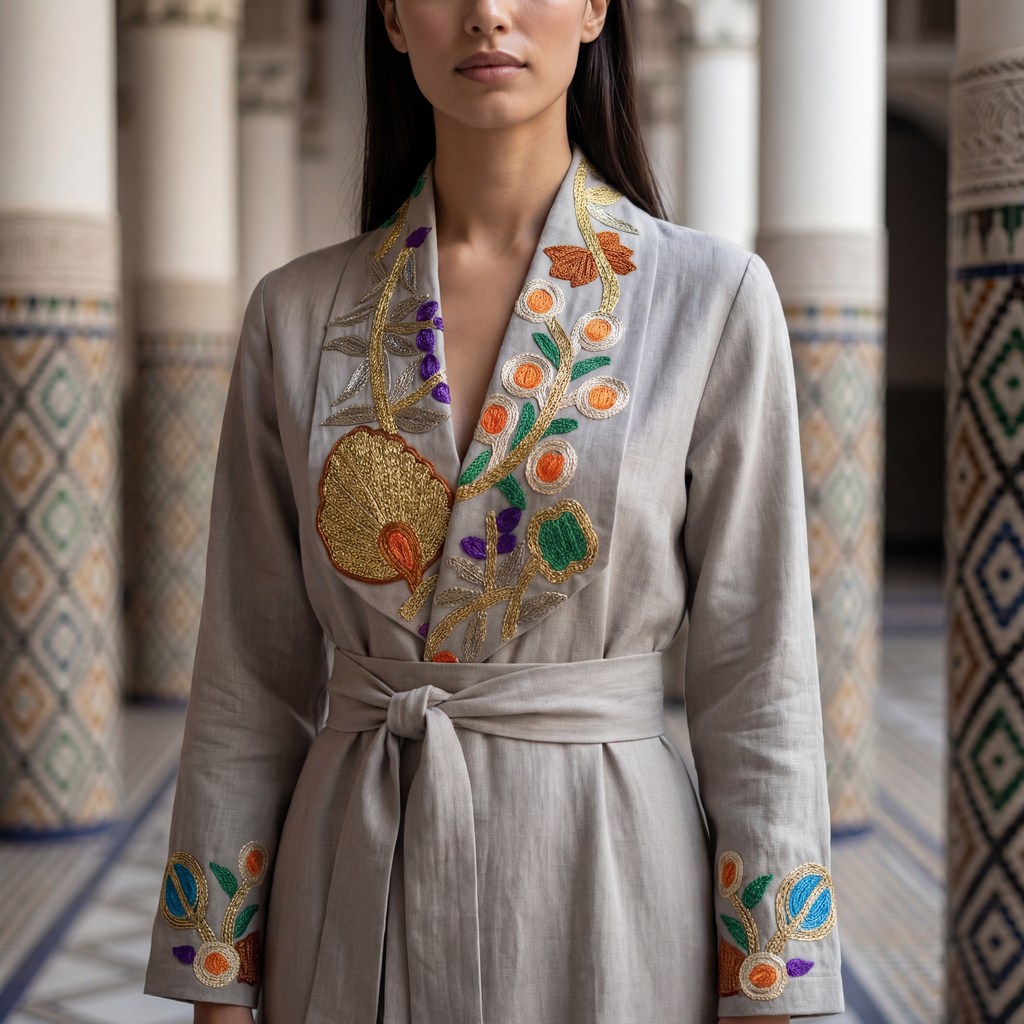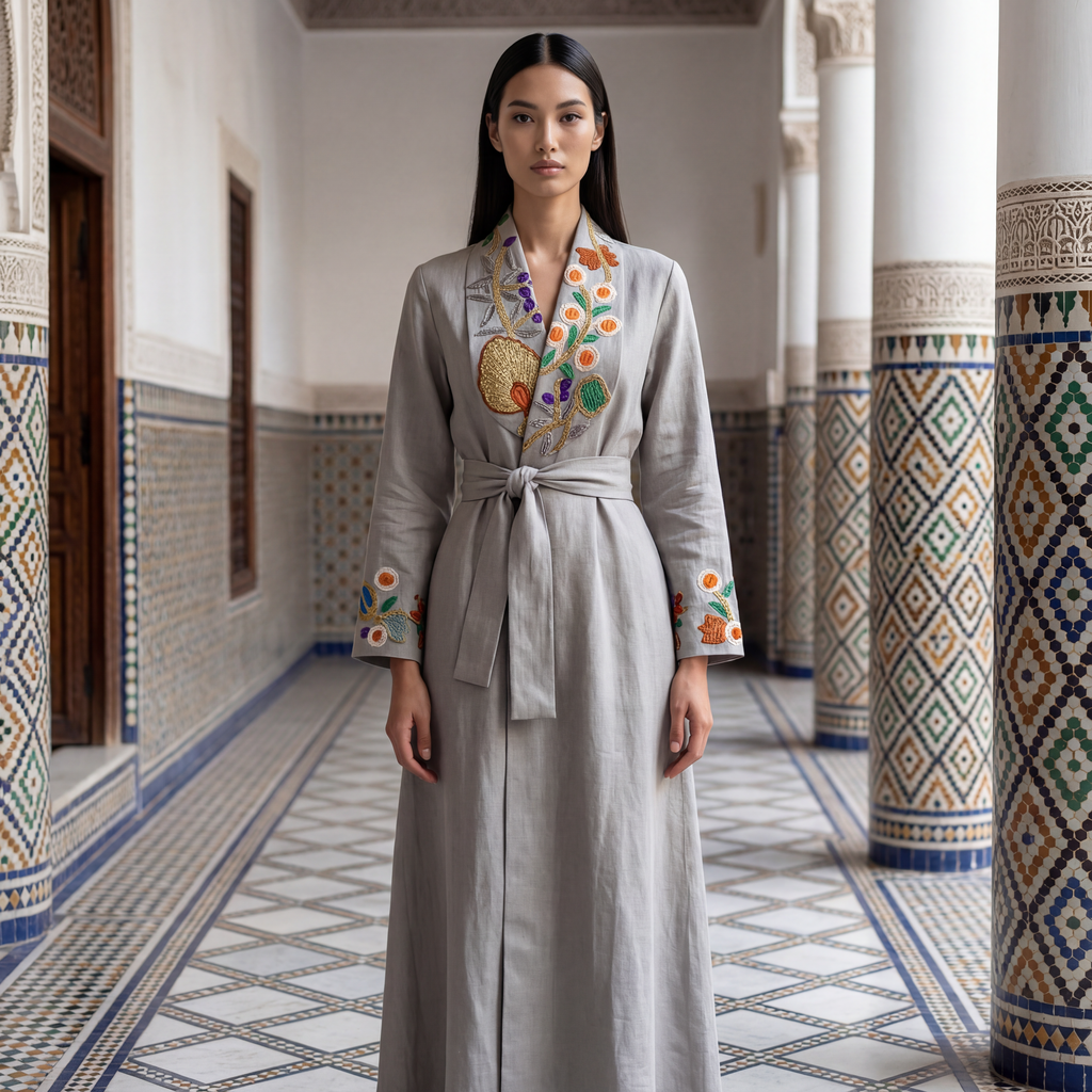 A luxurious wrap abaya crafted from premium silk bishtan, offering graceful fluidity that perfectly balances comfort and refined elegance. Exquisite hand-embroidered detailing showcases authentic Moroccan craftsmanship with a contemporary, sophisticated touch, adding unique depth to every element.