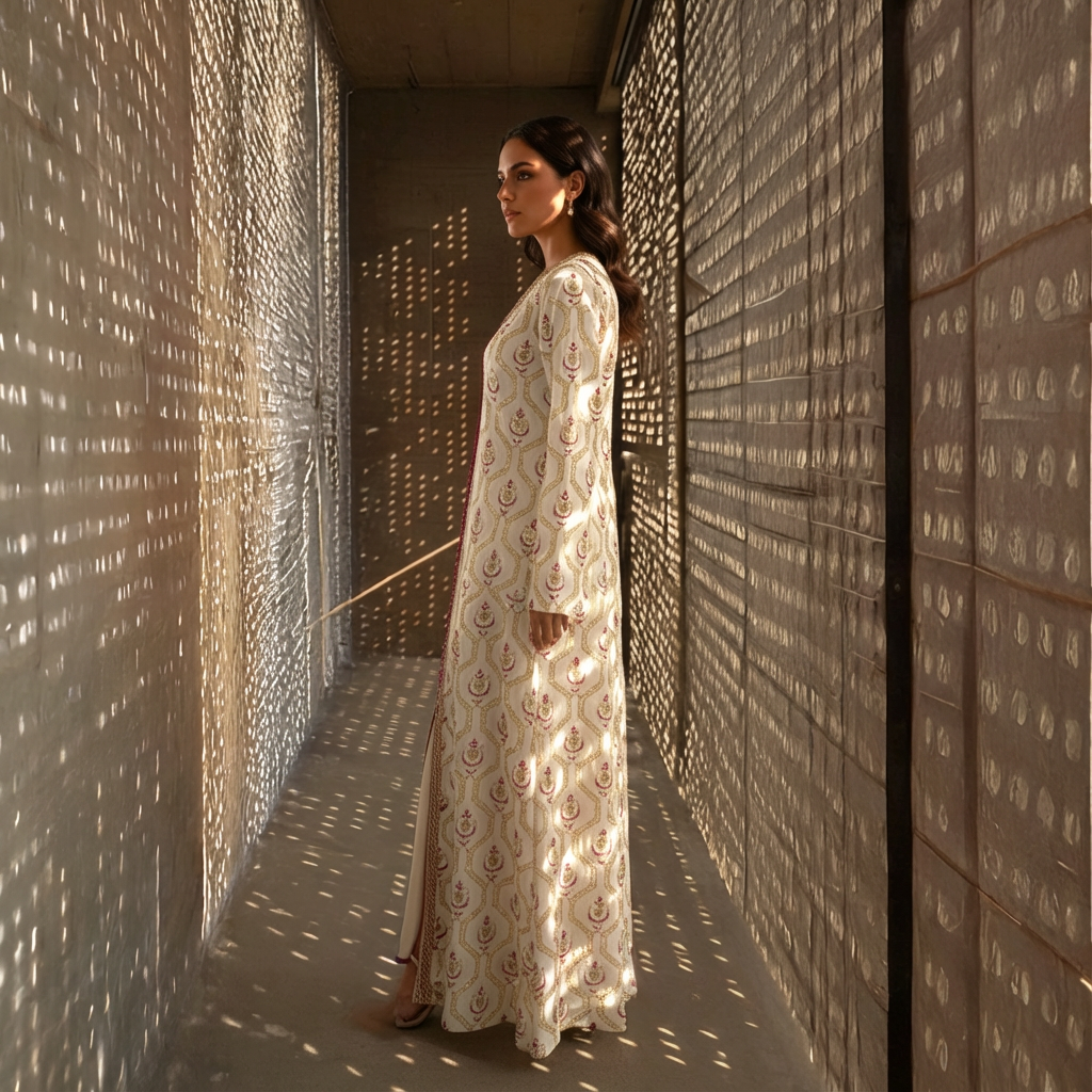 Beige Kaftan with Fuchsia & Gold Embroidery