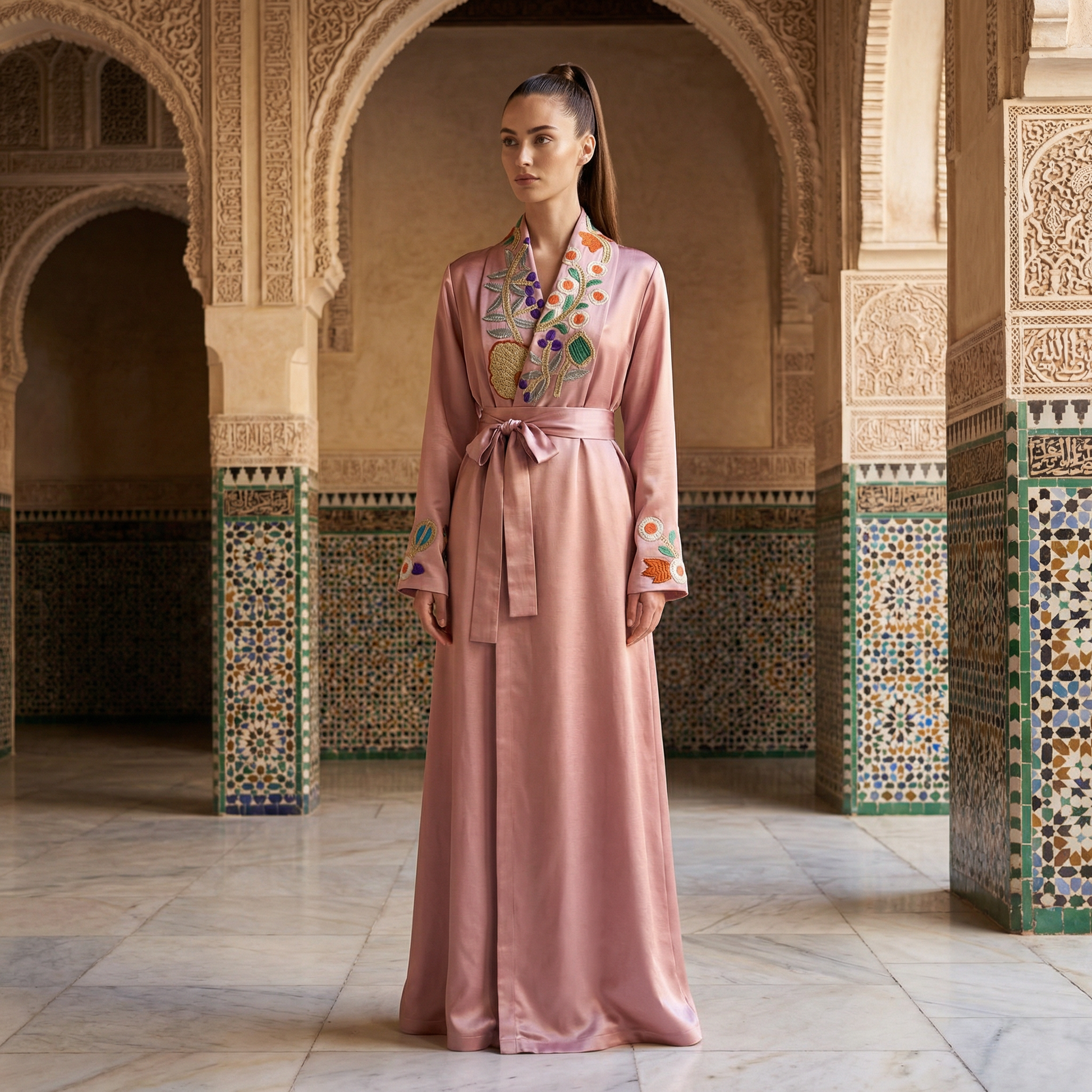 A luxurious wrap abaya crafted from premium silk bishtan, offering graceful fluidity that perfectly balances comfort and refined elegance. Exquisite hand-embroidered detailing showcases authentic Moroccan craftsmanship with a contemporary, sophisticated touch, adding unique depth to every element.
