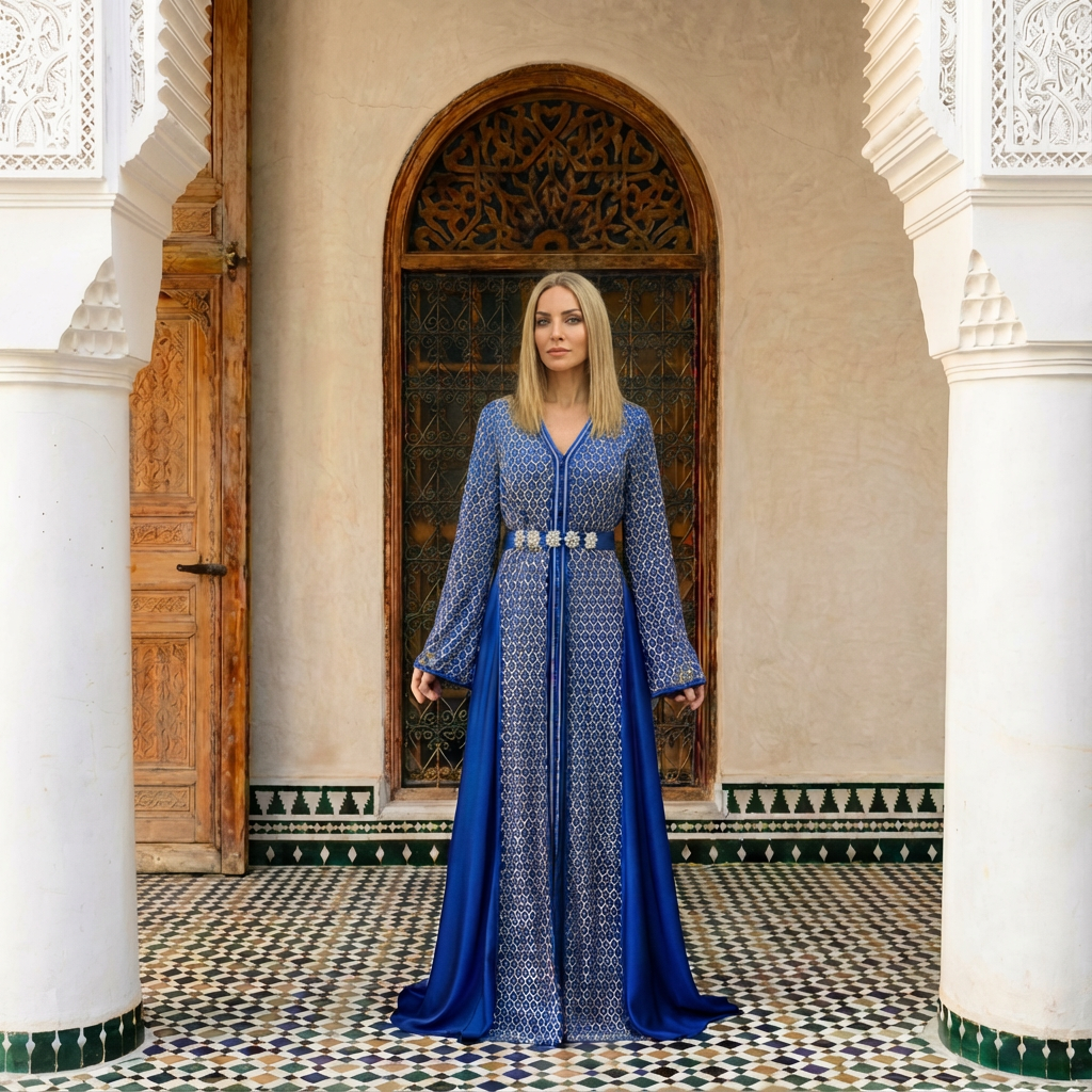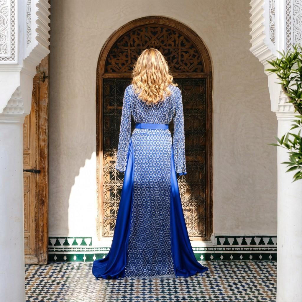 Royal Blue Kaftan with Hand Embroidery & Silk Satin + Necklace