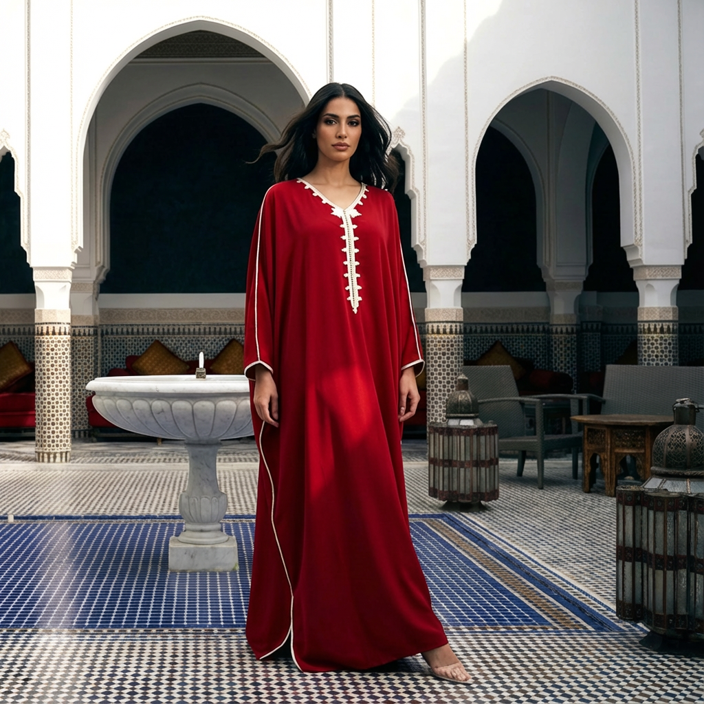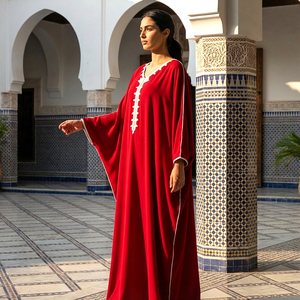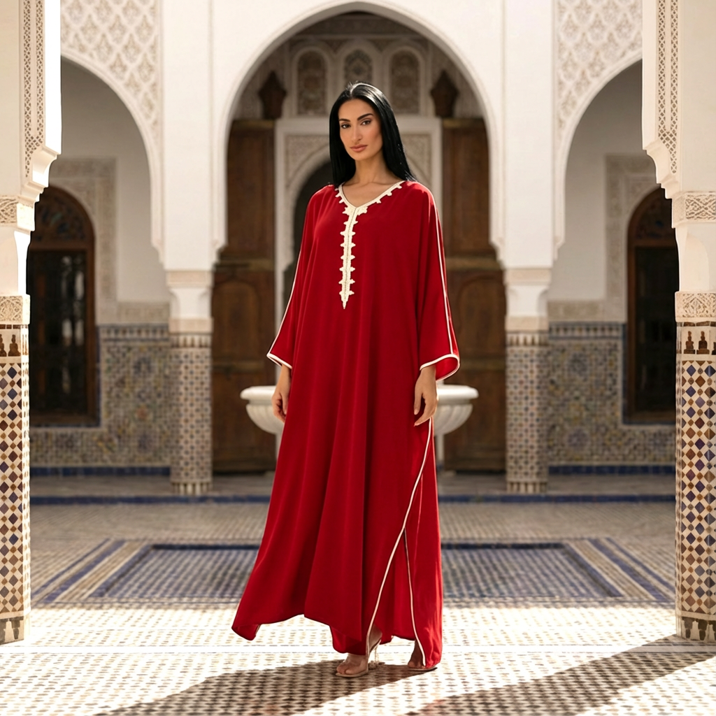 Adorned with warm hand-embroidered red detailing, the piece reflects authentic Moroccan craftsmanship with a contemporary twist. Its practical and versatile design makes it ideal for Ramadan gatherings, daytime events, and family visits, providing serene elegance that resonates with the spirit of the holy month.