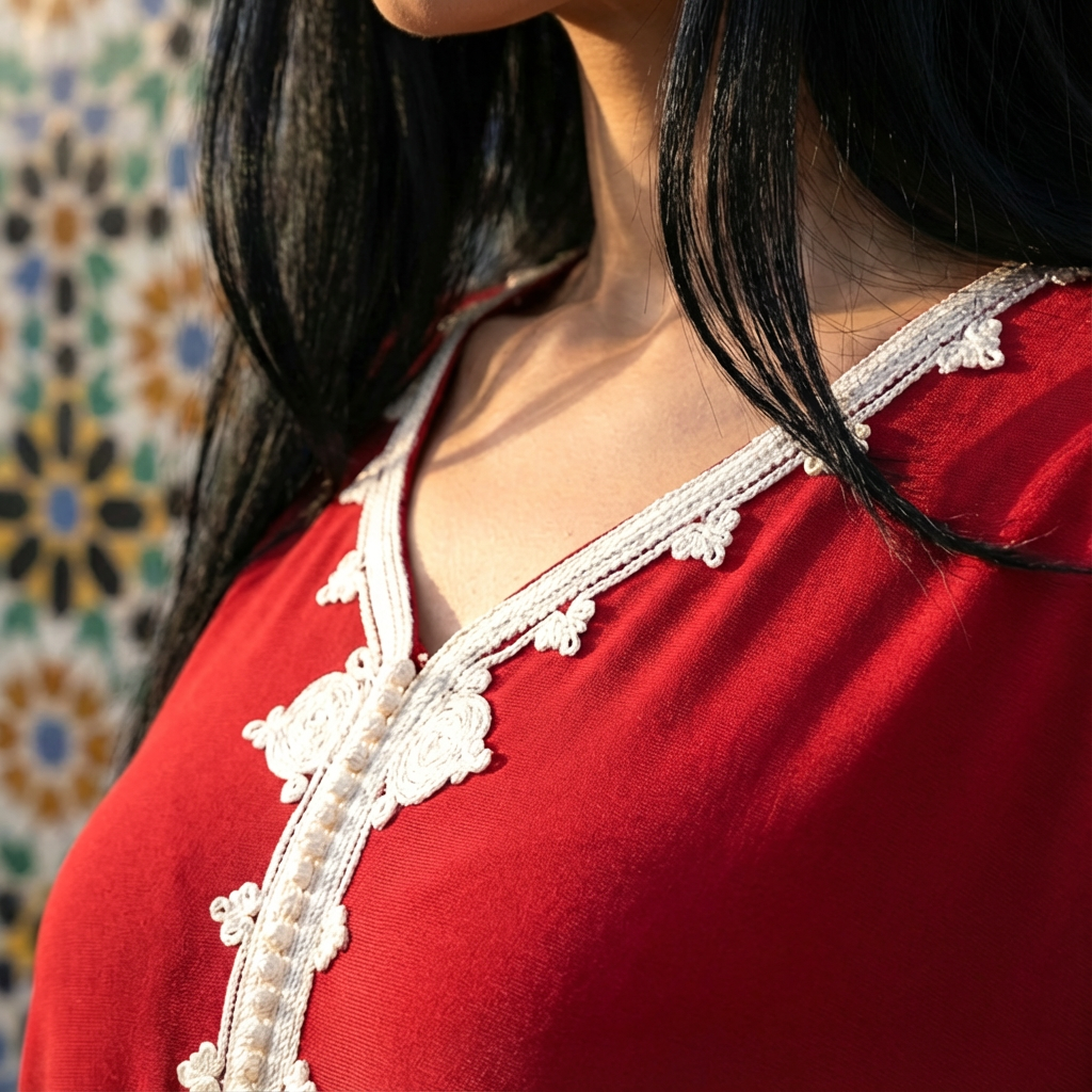 • Hand-embroidered red details reflecting Moroccan heritage