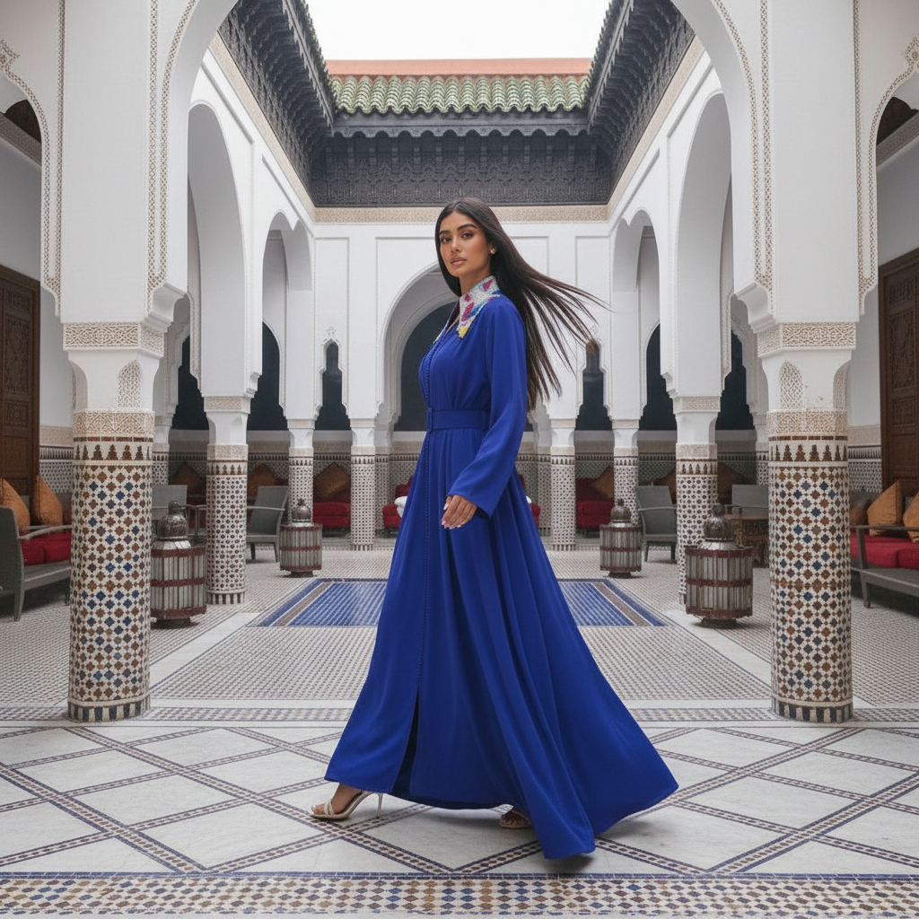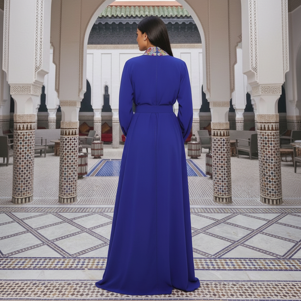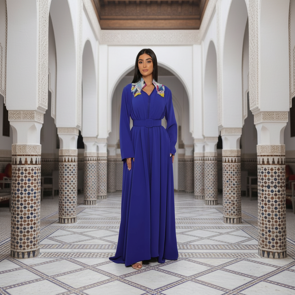 2 Piece Vibrant Blue Kaftan with Multi Color Neck Embroidery