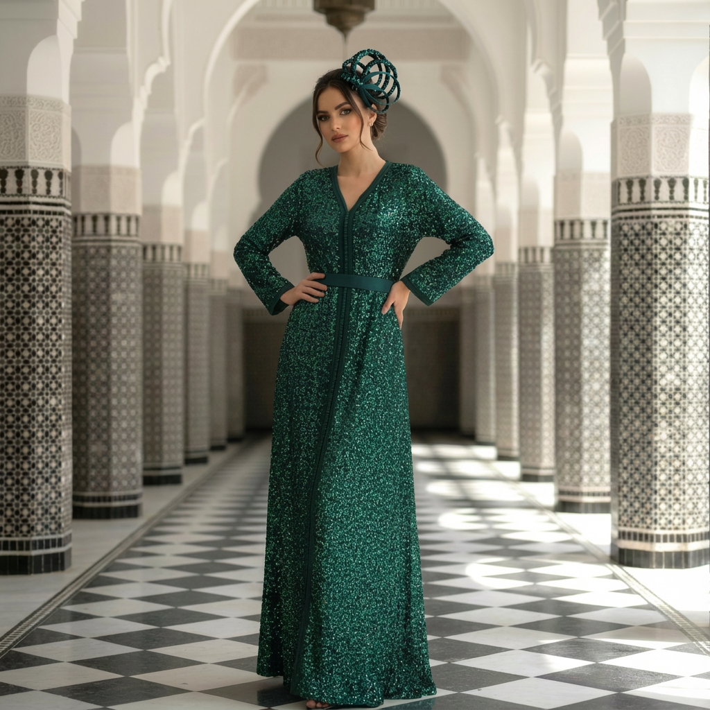 A captivating creation in regal green, radiating confidence and refined glamour with every movement. Designed to flow effortlessly over the silhouette, the luminous surface is balanced by a smooth silk satin lining, offering a sensorial experience that feels as luxurious as it looks.