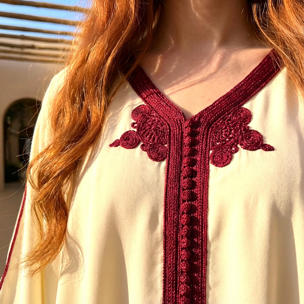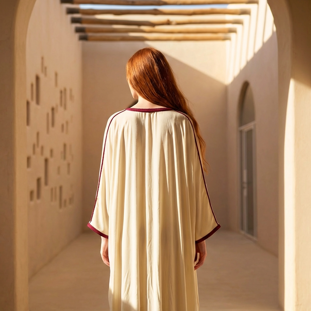 Off White Silk Kaftan with Red Stitching